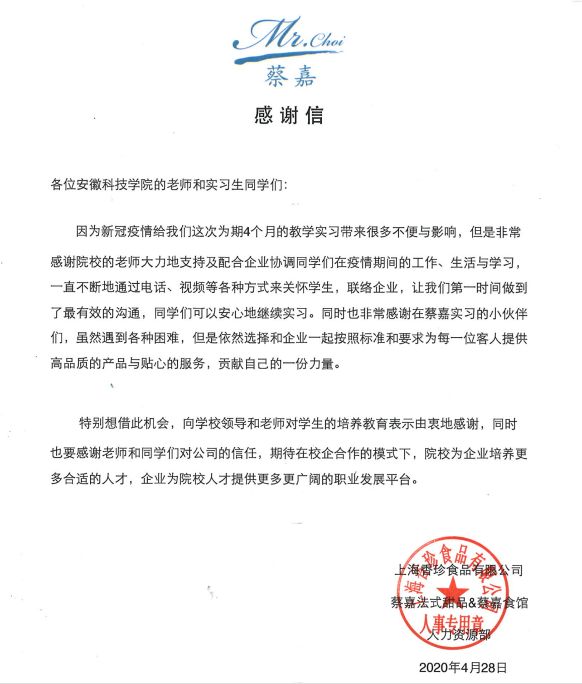 截至2020年4月30日,半岛官方网站_半岛(中国)股份有限公司,食品工程学院2017级烹饪与营养教育专业39名学生为期四个半月的校外专业实习正式结束。对于校外实习的这39名学生来说,是一次漫长而不同以往的实习经历。这次实习不仅让学生们学到了专业素养和技能,获得了实习单位的表扬和认可,更让他们从一封封来自援鄂医务人员的感谢信中学会了危难中的守望相助和感恩。