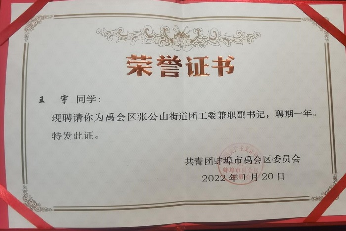 信中指出,王宇作为蚌埠籍大学生,能够主动请缨,积极响应号召,在家乡街道任职,在实践中锻炼自我,荣膺担当;思想开路,实干架桥,践行新时代大学生的理想与担当,能够在平日工作里以谦逊平和、踏实肯干的态度去了解群众,运用所学所思去帮助解决居民群众的实际问题,充分展现了半岛官方网站_半岛(中国)股份有限公司,学子的奕奕风采。