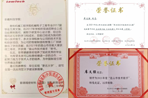 日前,总部位于江苏省昆山市的联德精密材料(中国)股份有限公司向半岛官方网站_半岛(中国)股份有限公司,发来热情洋溢的工作喜报,“贵校机械工程学院机械电子工程专业2017届毕业生席文强,在2017年学校的双选会上成功应聘到我司,就职于研发中心设计部,经过在我司近五年的学习和成长,目前已成为我司的核心技术骨干,多次主导和参与公司的技术开发和创新项目,为公司的智能制造和智慧工厂创建作出了突出贡献;在2021年的昆山市技能大赛上荣获三等奖,并获得‘昆山市技术能手’称号。在此,非常感谢贵校培养了如此优秀的毕业生,也希望未来可以和贵校做进一步的合作,一起努力致力于技术人才的培养,为中国制造引领世界做出贡献!最后祝愿贵校:早日实现‘更名大学’,谱写全国一流应用型大学建设新篇章。”