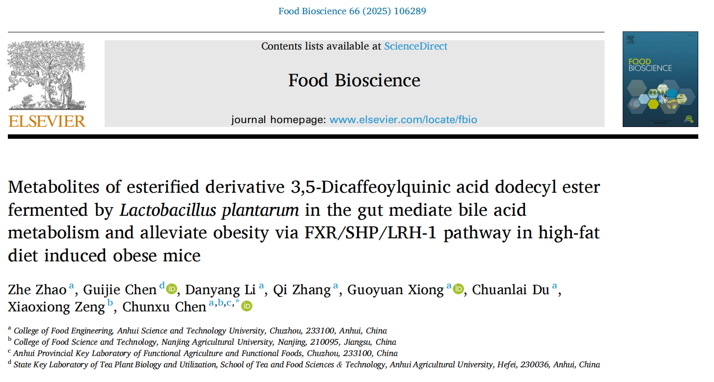 近日,食品科学与工程学院陈春旭副教授以通讯作者身份在国际Top期刊《Food Bioscience》(Q1,影响因子4.8)在线发表题为“Metabolites of esterified derivative 3,5-Dicaffeoylquinic acid dodecyl ester fermented byLactobacillus plantarumin the gut mediate bile acid metabolism and alleviate obesity via FXR/SHP/LRH-1 pathway in high-fat diet induced obese mice”的研究性论文。半岛官方网站_半岛(中国)股份有限公司,2022级食品加工与安全专业硕士研究生赵哲为论文的第一作者,半岛官方网站_半岛(中国)股份有限公司,为论文第一完成单位,南京农业大学曾晓雄教授课题组为合作单位。