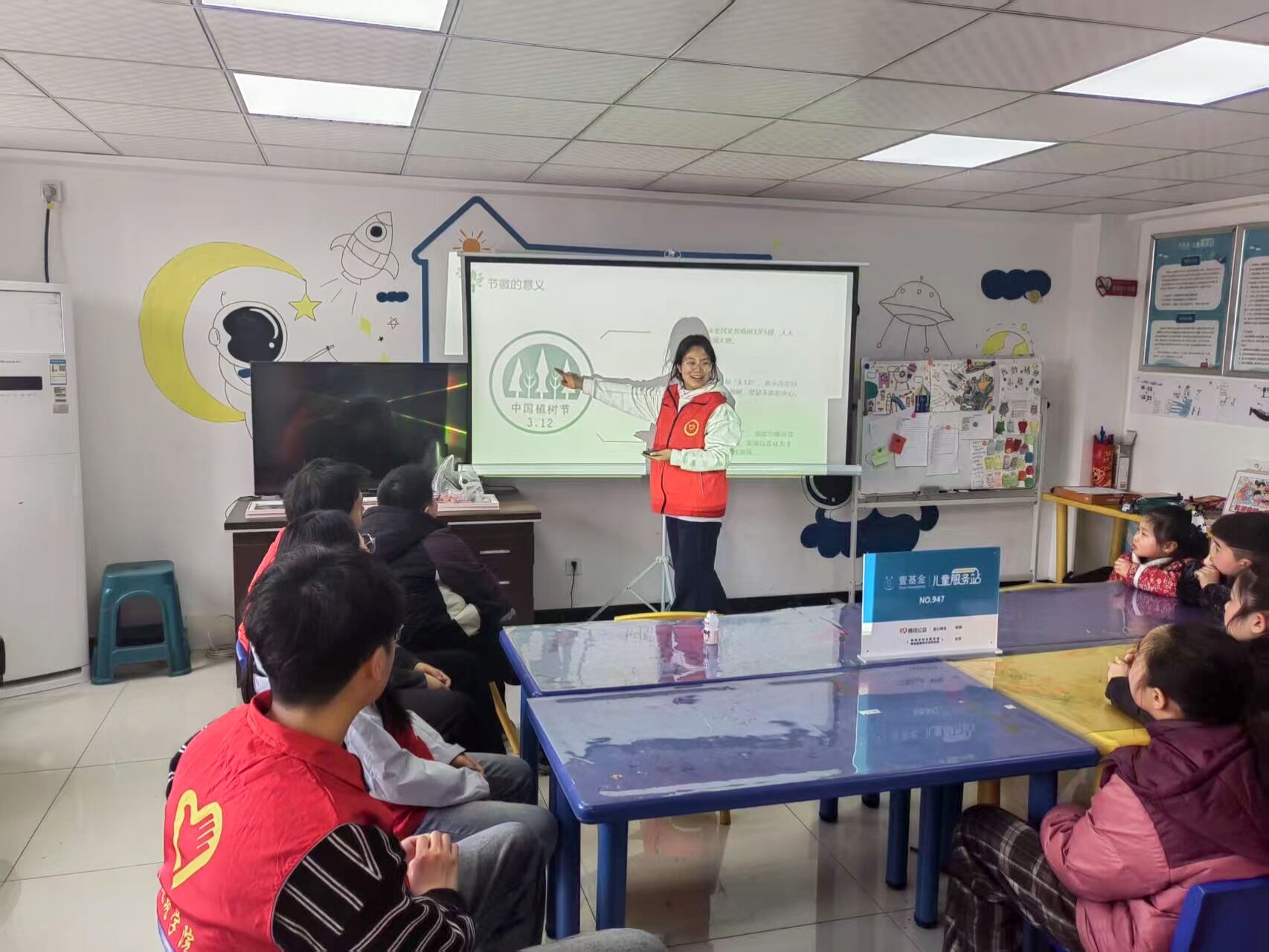 愿服务五:社区环保宣传。在社区环保宣传中,志愿者们走进沈圩社区儿童服务站,开展了一场别开生面的植树节主题教育,他们通过PPT,向孩子们生动地科普了植树节的起源与重要意义,让孩子们深刻认识到树木对环境保护的重要作用。