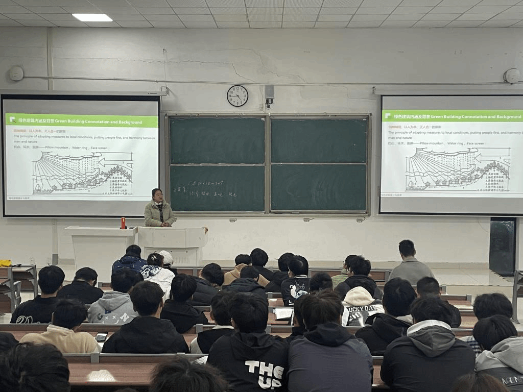 王薇教授从绿色建筑内涵与发展趋势、适宜性绿色建筑实践技术、绿色建筑助力双碳目标实现及人工智能赋能绿色建筑技术等四个方面,阐述了绿色建筑的发展历程和未来趋势。通过对国家战略的精确解读,在生态文明建设的大背景下,强调了“双碳”目标对我国绿色低碳发展的引领性作用,以及对环境质量改善和产业发展的巨大推动效应。王教授通过深入浅出的例举展示了绿色建筑技术对推动经济结构绿色转型,进而促进环境保护、经济社会协调和可持续发展所发挥的作用,让师生更加直观地认识绿色建筑及其特点。在互动环节中,就未来建筑发展和使用情况进行了探讨,并有针对性地解答了师生们有关学科发展、专业建设和职业规划等方面的疑惑。