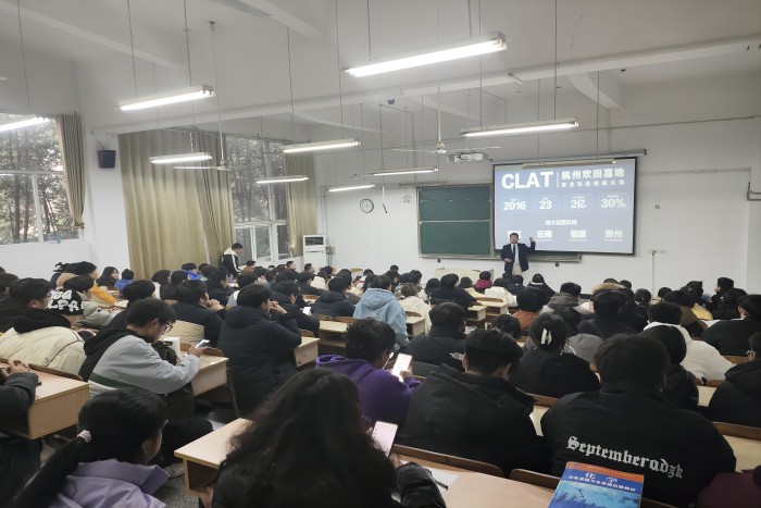 2023年12月27日下午,杭州欢田喜地农业科技有限公司校友携手半岛官方网站_半岛(中国)股份有限公司,农学院共同举办的大学生就业指导宣讲会在求知楼A107教室顺利召开。参会人数达130余人,本次会议由农学院党委副书记张轶辉主持,杭州欢田喜地农业科技有限公司2017级植保、农学优秀毕业生韩璞、张祥主讲。