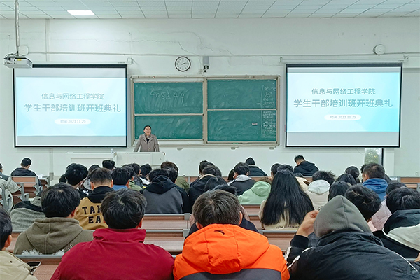为了促进新生学生干部发挥先锋模范作用,提高新入职学生干部的责任意识与综合素质。11月29日,信息与网络工程学院在致知楼C111教室,举办2023年学生干部培训班开班典礼。信息与网络工程学院党委副书记韦乃学、专职辅导员陈凯、崔北坤、丁阿敏、许磊出席本次开班典礼,学院2023级全体班级学生干部、分团委、学生会、易班工作站、心理委员联合会等学生组织新入职同学参加典礼。