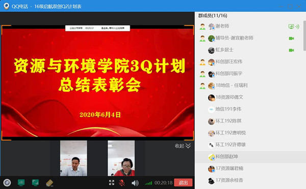 谢宜勤代表学院全体师生向即将毕业的2020届毕业生表示祝福,并依次介绍出席此次会议的各位领导及参加此次会议的各位同学。李孟良首先对3Q计划实施情况及成果进行解读,表示此项计划是提升学院教育工作水平和加强教育工作质量的重要举措,是实现学生成长成才、全面发展的重要理论。学生积极参加,导师认真指导,不仅有效提高学生和老师之间的互动,同时也加强学生的学业创新创业和毕业就业的能力。他对参加双创计划的同学们所取得的成绩表示充分肯定,希望接下来学院双创计划工作更上一层楼。并对2020届毕业生送上祝福,希望资环学子能够充分发挥专业优势,积极投身祖国环保事业,脚踏实地、锐意进取,为实现绿水青山的美丽中国梦添砖加瓦。