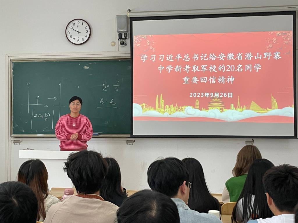 为全面培塑学生的爱国心、报国情、强国志,鼓励引导青年立大志、明大德、担大任,9月25-28日,财经学院各班级召开主题班会,学习习近平总书记给安徽省潜山野寨中学新考取军校的20名同学回信精神。