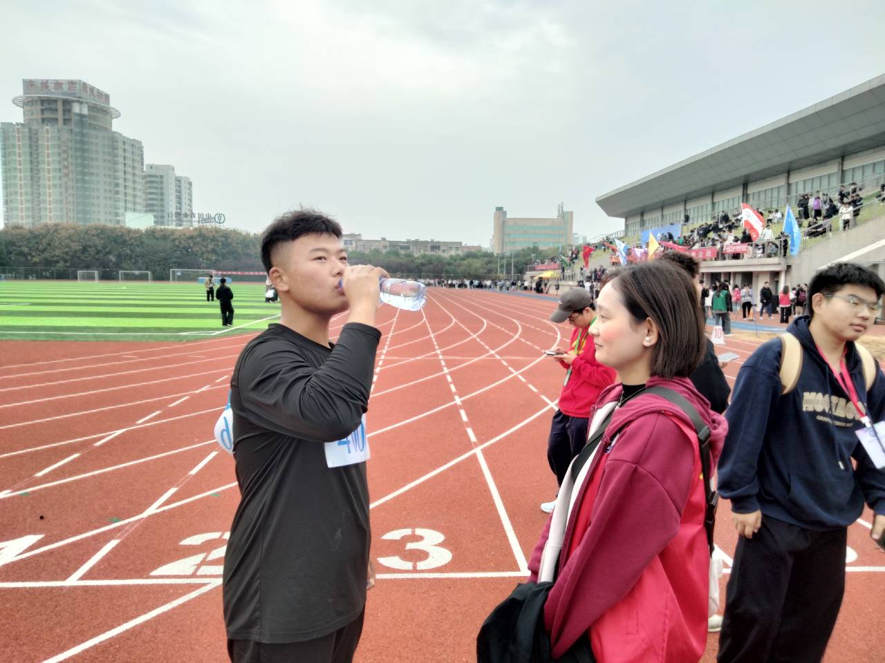 早上6点半,志愿服务团成员就从龙湖校区出发,准时到达各自的服务岗位。从检录到比赛结束,志愿者们一直陪伴在运动员的身边,帮他们放松肌肉、拿衣递水。他们忙碌于操场上,身影随处可见,默默奉献、尽心尽力地为运动员提供优质、体贴、热情的服务。志愿服务团是运动员坚实有力的后勤保障,是幕后的“无名英雄”,也是学院“责任 成才”主题教育的育人成果。