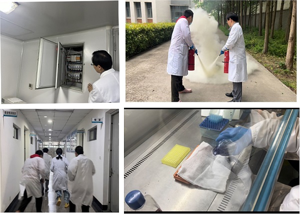 贺绍君强调要充分认识安全工作的重要性,严格执行好实验室安全规章制度,强化生物安全、消防安全、危化品安全意识,规范日常管理。在实验室相关管理文件指导下,所有人员首先对各功能室开展全面的安全隐患大排查,排除了包括水、电、插座、开关、病原微生物、危化品、仪器设备、烟感报警器等方面隐患,具体布置实验室日常安全检查内容以及日常巡查要求;随后,实验室师生开展安全应急演练,包括实验室突发安全事故的人员应急逃生路线和逃生要领,讲解示范干粉灭火器和应急水阀的日常管理和使用方法,生物安全柜内病原物质溢洒应急处置,危化品购买、存储和使用方法。