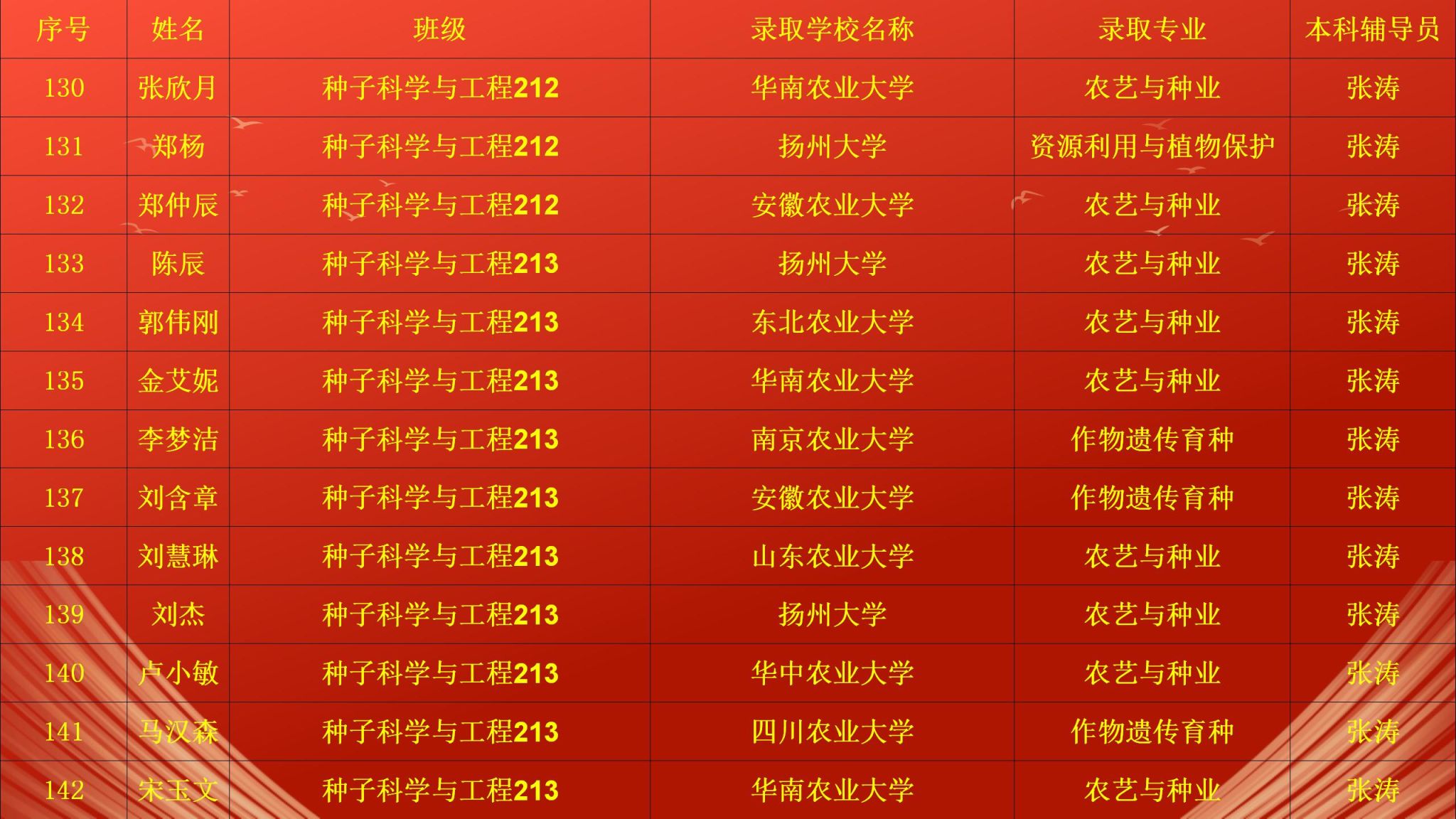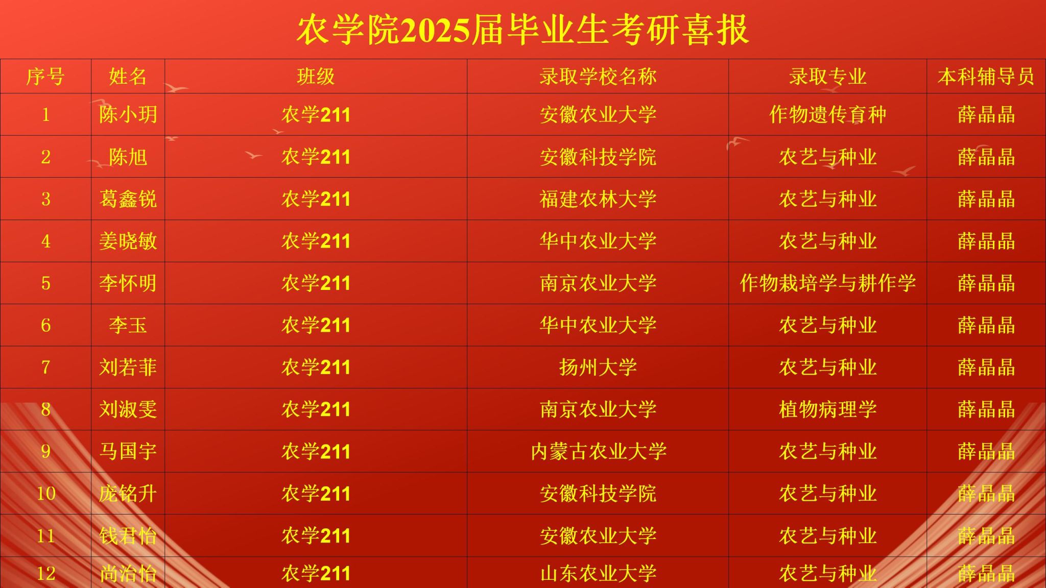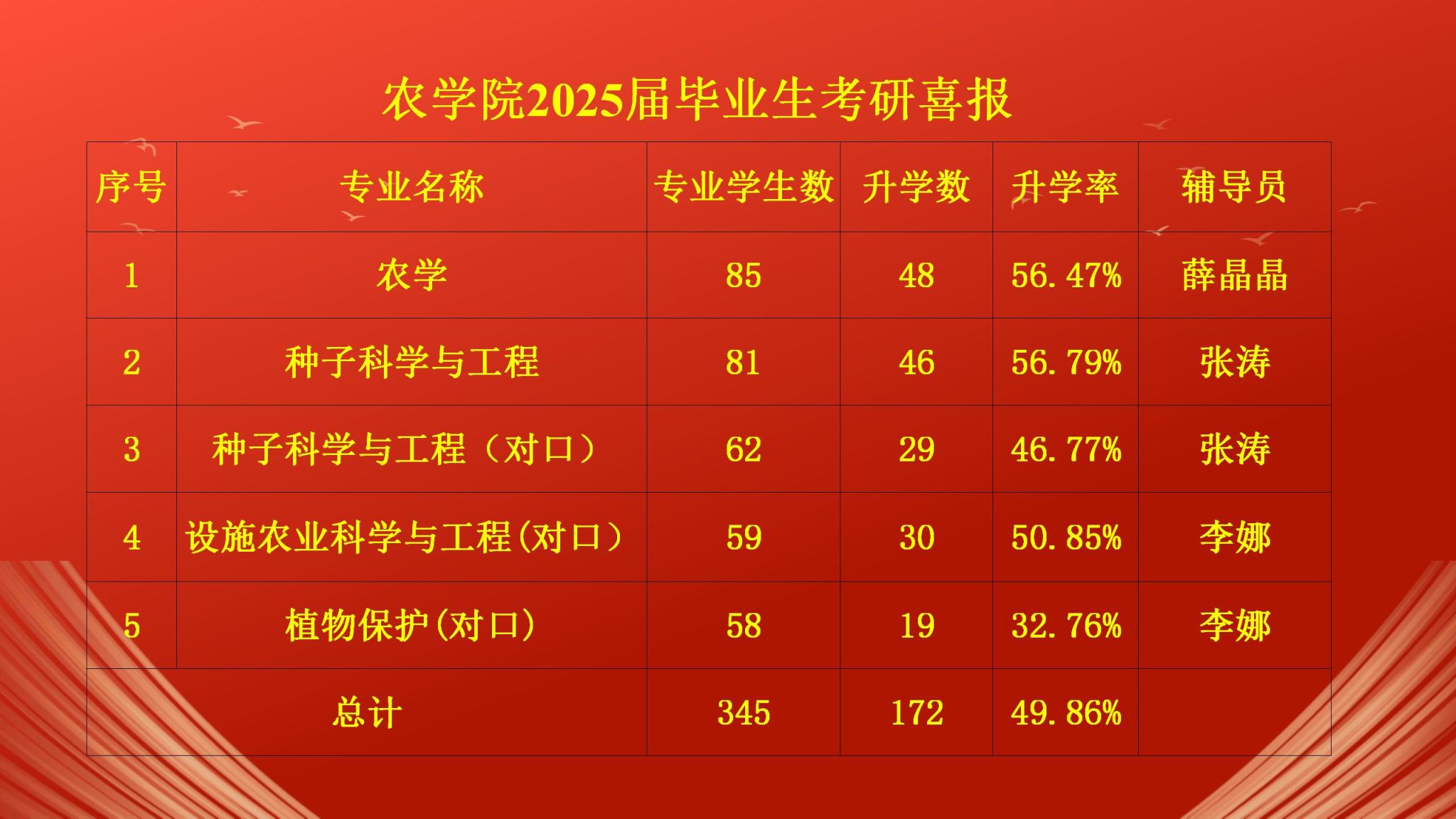 2025年全国硕士研究生录取工作落下帷幕,农学院2025届毕业生考研取得佳绩,345名毕业生,172人考取国内外硕士研究生,升学率达49.86%,实现“两生一硕士”。其中,66人被中国农业大学、西北农林科技大学、华东理工大学、重庆大学、南京农业大学、华中农业大学、华南农业大学、西南大学等双一流建设高校录取。