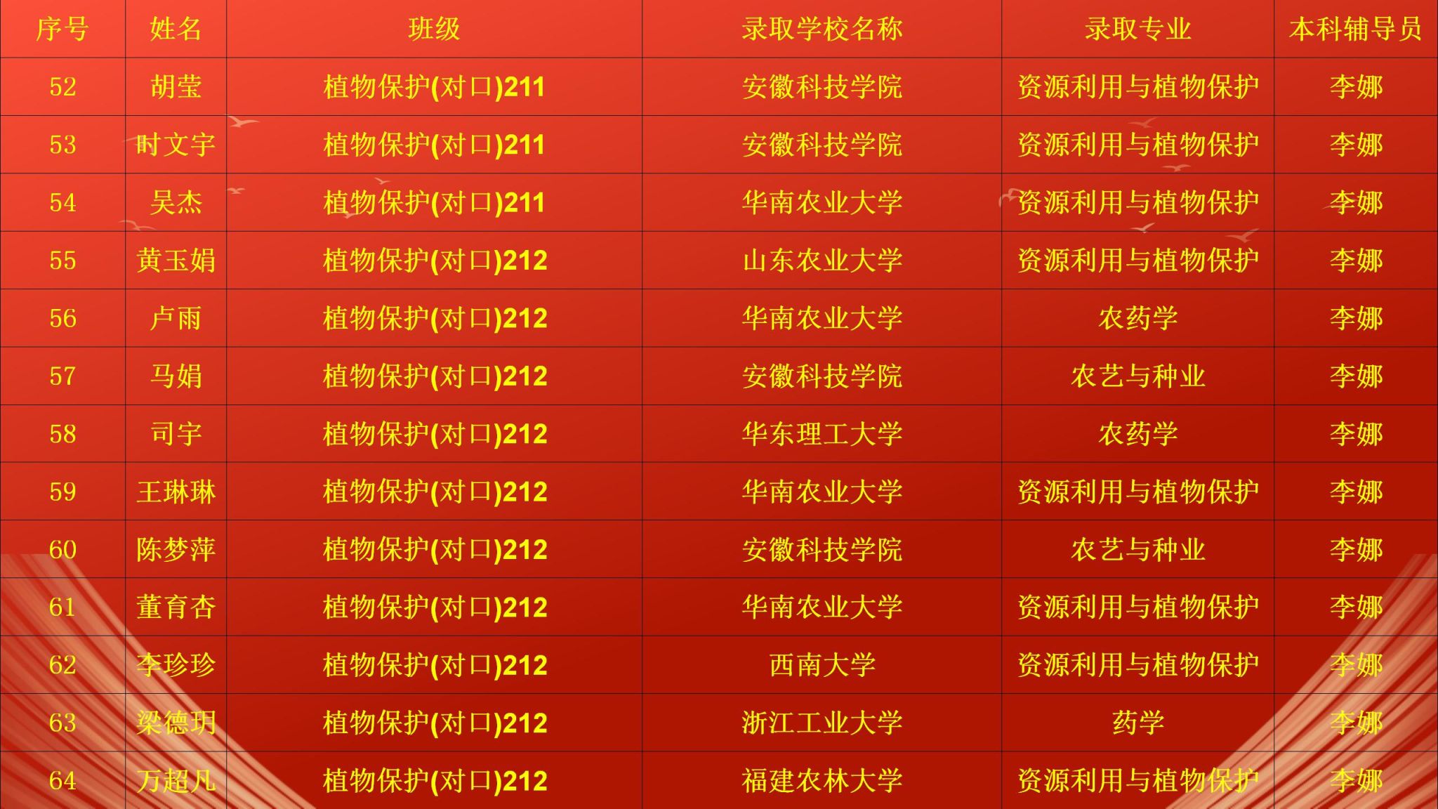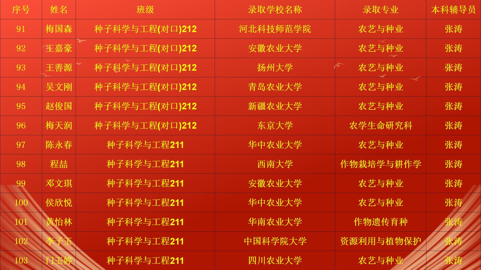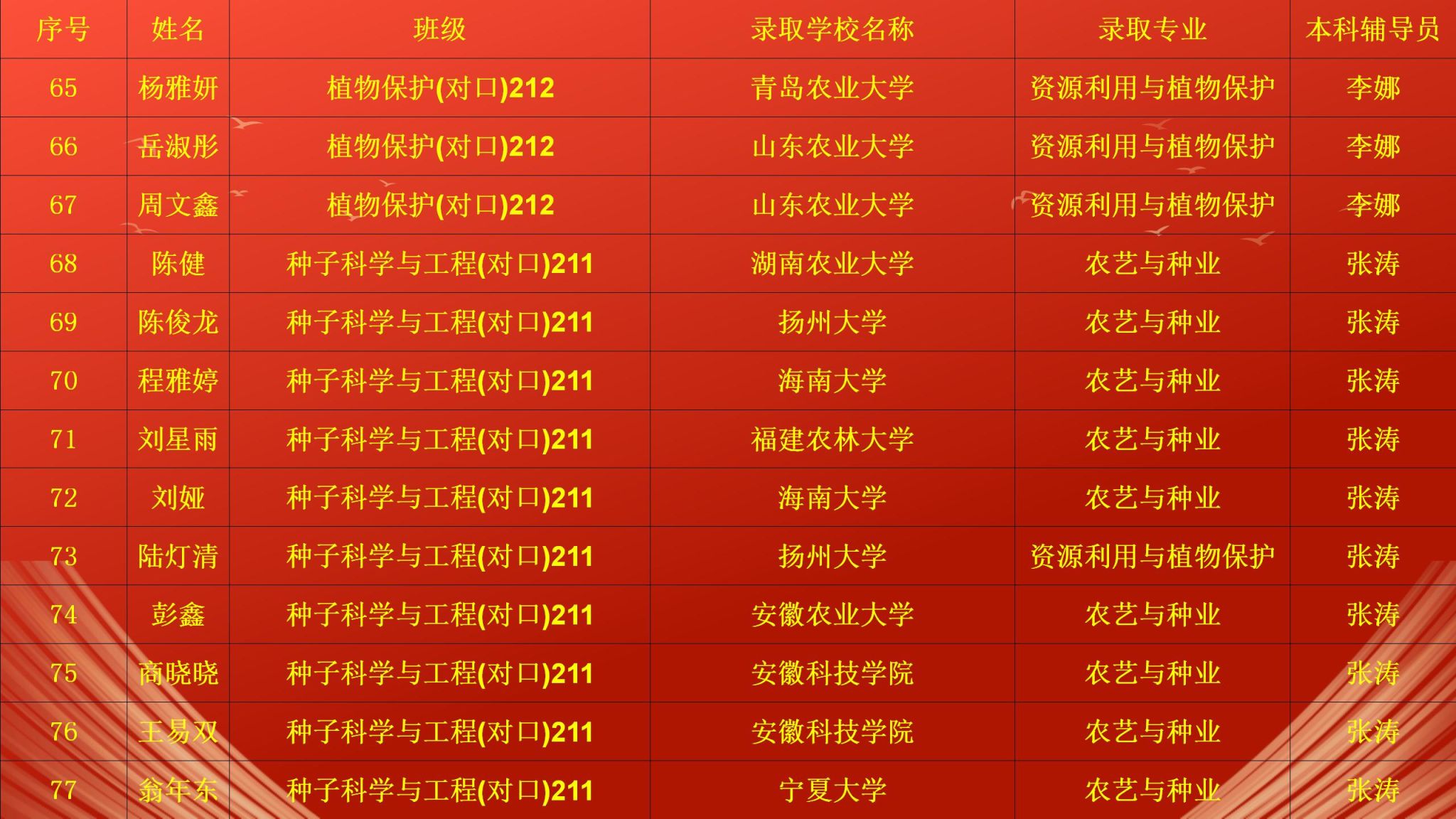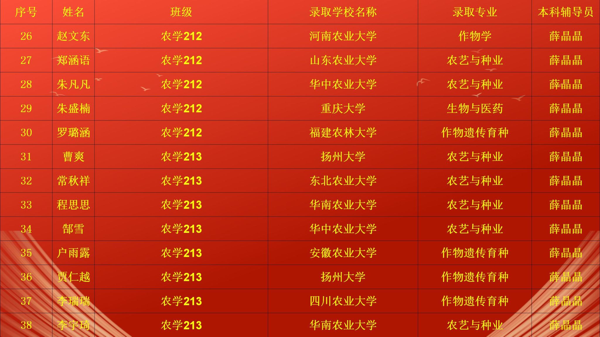 2025年全国硕士研究生录取工作落下帷幕,农学院2025届毕业生考研取得佳绩,345名毕业生,172人考取国内外硕士研究生,升学率达49.86%,实现“两生一硕士”。其中,66人被中国农业大学、西北农林科技大学、华东理工大学、重庆大学、南京农业大学、华中农业大学、华南农业大学、西南大学等双一流建设高校录取。