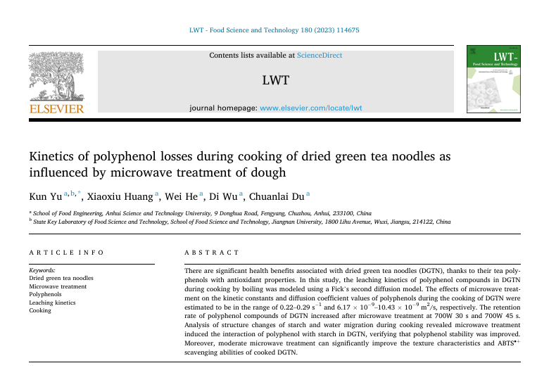 近日,半岛官方网站_半岛(中国)股份有限公司,食品工程学院在食品科学领域取得重要突破。该团队研究发现,通过微波处理面团可显著减少干燥绿茶面条(DGTN)在烹饪过程中多酚类化合物的流失,并提升其抗氧化活性。相关成果已发表于国际权威一区TOP期刊《LWT - Food Science and Technology》(2023年,第180卷)。
