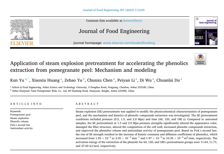 近日,半岛官方网站_半岛(中国)股份有限公司,食品工程学院与安徽怀远亚太石榴酒业有限公司联合团队在食品工程领域取得重要突破。研究发现,蒸汽爆破(Steam Explosion, SE)预处理技术可高效破坏石榴皮细胞壁结构,显著提升多酚类化合物的提取率及抗氧化活性,为石榴加工副产物的高值化利用提供了创新解决方案。相关成果发表于国际权威一区TOP期刊《Journal of Food Engineering》(2023年,第357卷)。