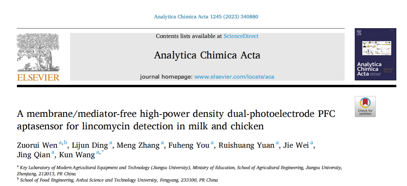 前沿|食品学院文作瑞博士开发一种无膜型光催化燃料电池适配体传感器用于牛奶和鸡肉中兽药残留检测新方法