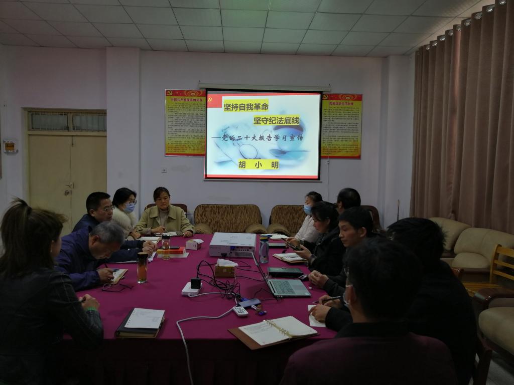 汪徐春带头领学了习近平新时代中国特色社会主义思想和党的二十大精神、党的二十届二中全会精神、省委十一届四中全会精神、党史学习教育等一系列文件。支部纪委委员胡小明以贯彻落实党中央全面从严治党、全面依法治国的战略布局为切入点,为大家上了一堂题为“坚持自我革命  坚守纪法底线”的党课。按照学思用结合、知信行统一的思路,他从“坚持自我革命、严守党的纪律、坚守法律底线”三个方面向大家作了一一阐述。