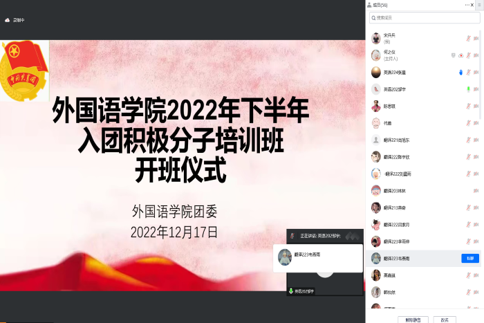为加强对入团积极分子的培养和教育,12月17日下午,外国语学院团委通过腾讯会议举行2022年下半年入团积极分子培训班开班仪式。学院团委副书记宋兵兵出席开班仪式,学院团委成员和本期50名入团积极分子参加仪式。