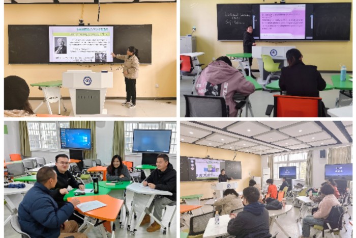 各听评课小组教师以具体的教学内容进行课堂教学展示。在展示过程中,外国语学院教师精神饱满、教态大方、教学目标明确,教学设计合理,教学环节衔接紧密,教学内容充满知识性与趣味性,教学过程注重将知识传授、能力培养和品格塑造有机结合,能够充分利用信息技术进行课堂互动。每位教师展示结束后,同组教师重点从课程思政、教学内容、教学态度、教学方法和教学效果等方面进行了点评。教师们互相讨论,交流自己的思想和看法,研讨氛围和谐热烈。参与听评课的党政领导对教师的授课和评课进行了点评。