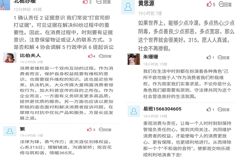 人民对美好生活的向往,离不开安全放心的日常生活消费。本次“3.15消费者权益日”易班活动的举办,引起了同学们对消费者权益保护的重视,开拓了同学们的视野,提高了同学们维护消费者权益的能力,营造了绿色安全的消费氛围,为进一步构建和谐的消费环境奠定了基础。(特约通讯员:王培培)