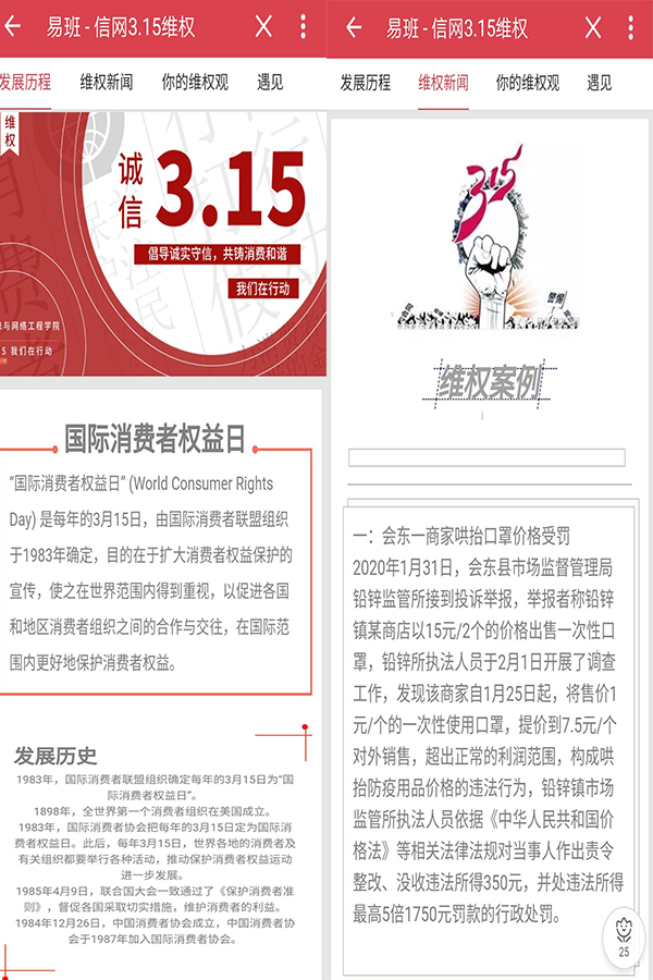 为维护学生消费者的合法权益,增强学生消费者权益保护意识。3月15日,信息与网络工程学院举办“3.15消费者权益日”易班宣传活动,本次活动面向我院全体师生。