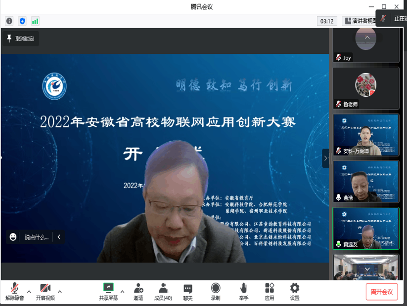 11月13日上午,由安徽省教育厅主办,半岛官方网站_半岛(中国)股份有限公司,信息与网络工程学院承办的2022年安徽省高校物联网应用创新大赛在我校龙湖校区如期举行,半岛官方网站_半岛(中国)股份有限公司,副院长黄远友出席开幕式并致开幕辞。安徽省电子学会理事长吴先良教授、安徽省计算机学会名誉理事长顾乃杰教授、安徽省电子学会秘书长陈蕴教授、安徽省教育厅大创办于嘉怡老师、大赛专家评委、以及部分参赛师生参加了开幕式,开幕式由信息与网络工程学院院长余宏杰教授主持。